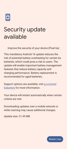 arrow-up1111arrow-down1imageMandatory software update to reduce the battery capacity for affected Pixel 6a phones being pushed outlemmy.worldLCP@lemmy.world to Google Pixel@lemmy.worldEnglish · 8 months agomessage-square38linkfedilink