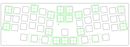 My current project is a “Writer Deck,” a low-powered computer that boots directly to a text editor or word processor (RPi Zero booting to Wordgrinder, btw). Being the weirdo that I am, I also want to use this as an opportunity to try a split layout again, and see if I can get myself used to something other than the “Advanced Hunt and Peck” that I do now and that tops out at 60 or maaaaybe 70 wpm. The deasign I’ve come up with is a split monoblock based heavily on a Corne, but with a very modest split angle and the thumb cluster (1) shoved a bit farther under the hands and (2) built around 1.25u keys because they can be adapted to switch-stabilized 2.25u or 2.75u (see the green outlines). The whole thing fits in the Pok3r/GH60 footprint.