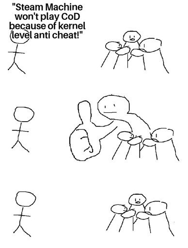 I mean thats gonna be the joke. If steam machine really does take off, developers will come, just like they’re starting to cater to the deck. It’ll set a standard for what people want to play on and what they need to make sure their game works on. This is beyond anti cheat and DRM but it’ll be interesting to see how the momentum picks up.
