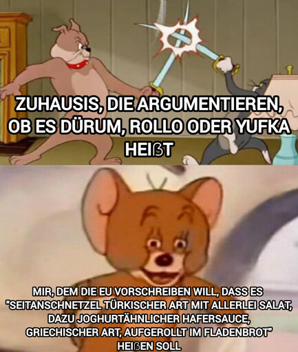 minus-squareGargleBlaster@feddit.orglinkfedilinkarrow-up28·10 days agoDürüm, Yufka oder “Seitanschnetzel türkischer art mit allerlei Salat, dazu joghurtähnlicher Hafer sauce, griechischer Art, aufgerollt im Fladenbrot” find ich alles vertretbar. Aber Rollo? Auf einer Ebene mit “Schlafi”