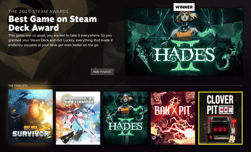 mr_MADAFAKA@lemmy.ml to Steam Hardware@sopuli.xyz · edit-21 month agoHades II won Best Game on Steam Deck Award - The 2025 Steam Awardslemmy.mlimagemessage-square16linkfedilinkarrow-up1162arrow-down11file-text
