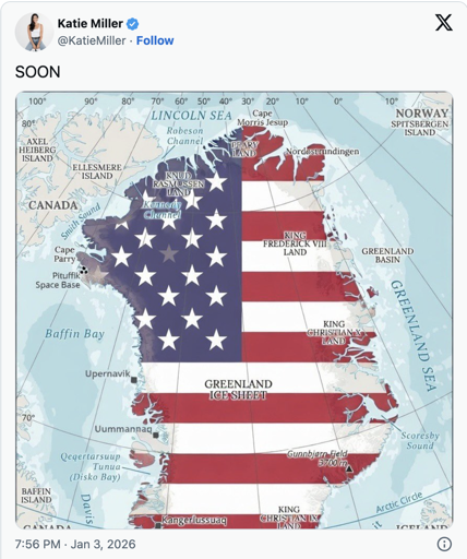 Former Trump administration official and wife of top Trump aide Stephen Miller, Katie Miller, posted Saturday on X (formerly Twitter) an image of Greenland covered in the U.S. flag with the text “SOON”.