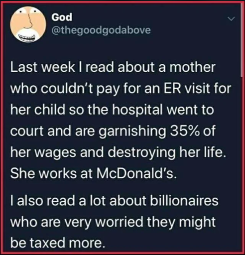 I know a woman. She grew up with her mom, and her brother. When her brother was born, he had significant medical problems. (The father, being just about the worst POS to exist, reacted to news of his son’s medical problems by finding himself a new girlfriend.) Since this happened in the US, the family had to sell their house and property, and this family grew up on the edge of homelessness as a result.